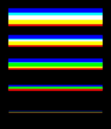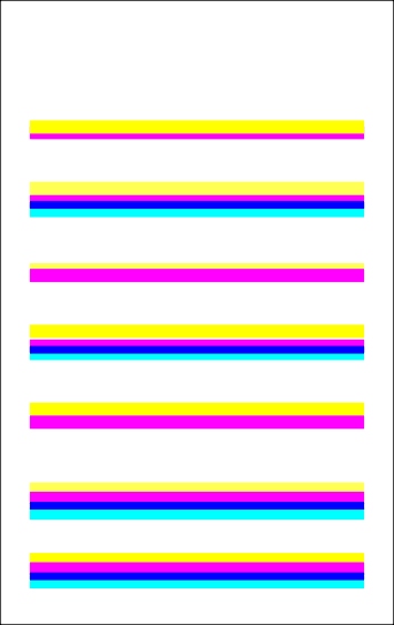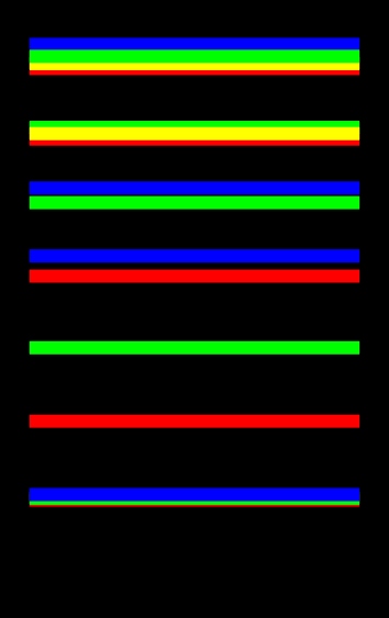| Image 3: 8 colors on white, 8 colors on black For each of the recognizable colors below, you can use the prism to determine the 'primary' colors used to make them. Note that the primaries are subtractive when viewed on a white background, and additive when viewed on a black background.